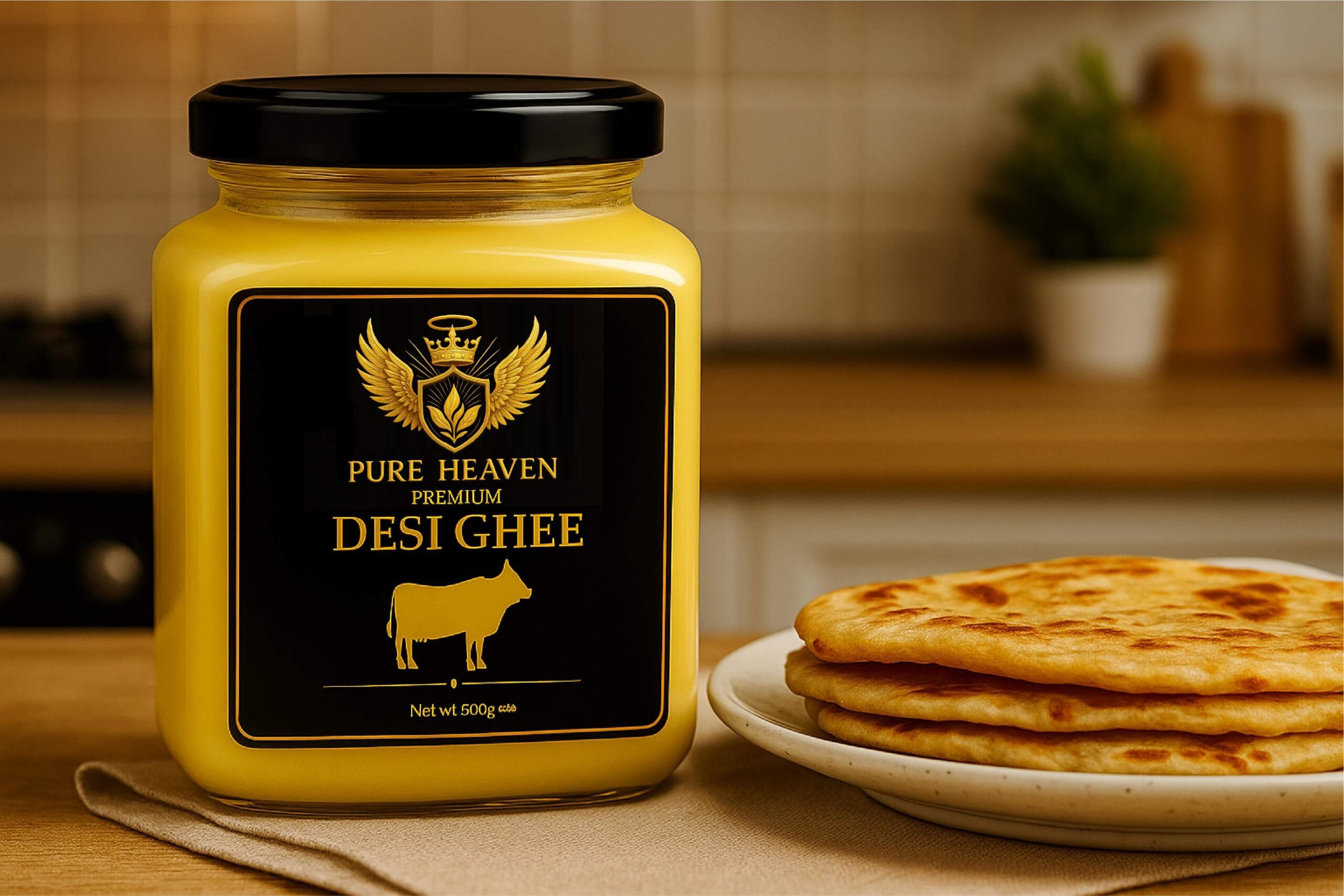 Experience the golden richness of Pure Heaven Desi Ghee, made from pure, farm-fresh butter to deliver an authentic desi taste. 🧈